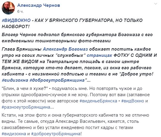 Чернов процитировал Чернова, которые решили, что они ничуть не хуже Богомаза. И вместо вида из окна сделал собственный кривой снимок, который назвал «вид в окно». И написал, что утро в Брянске вовсе не доброе, как утверждает губернатор, а разное.